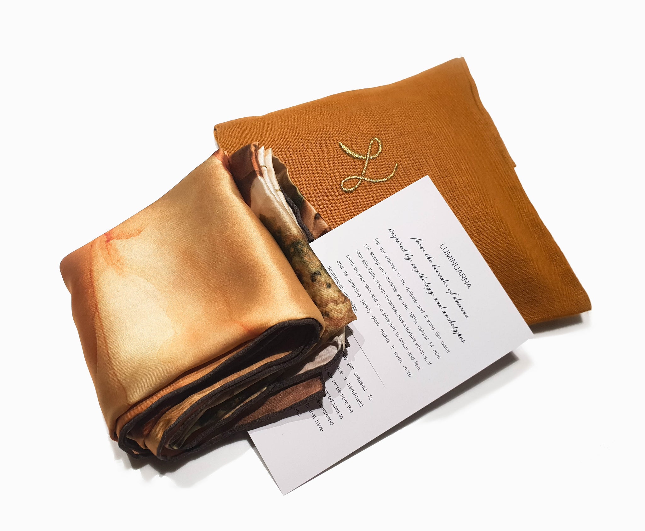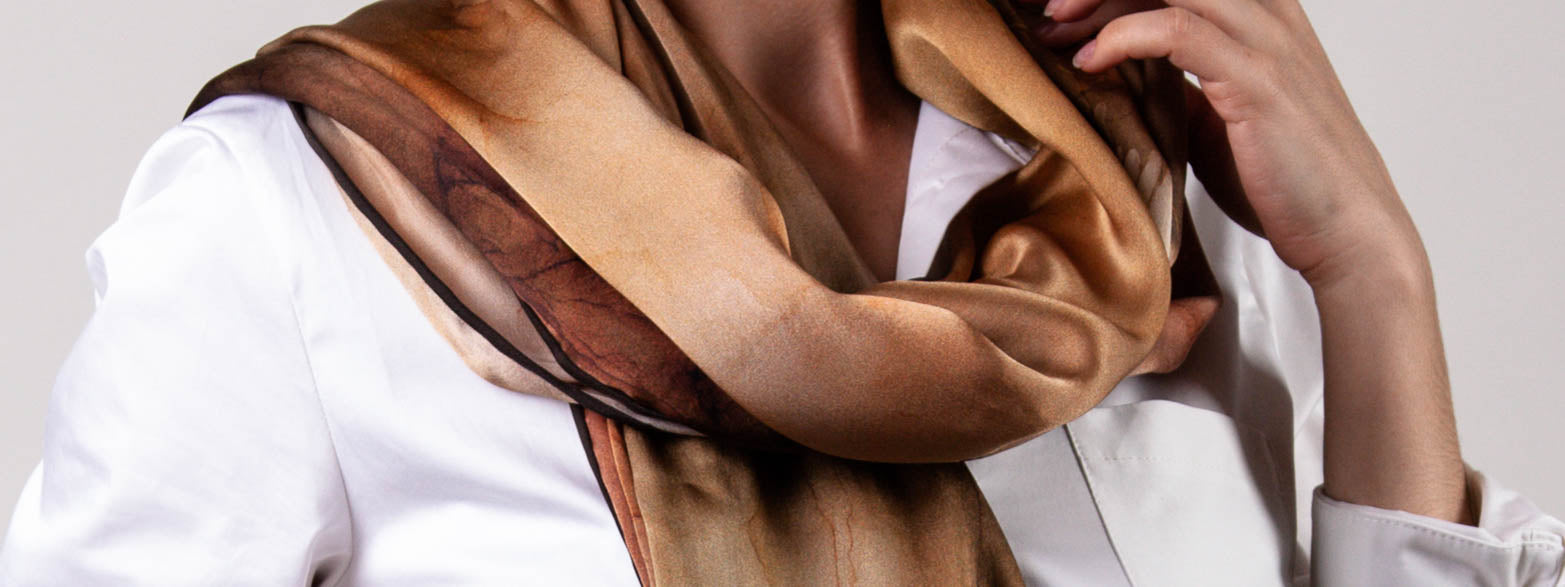 For our scarves to be delicate and flowing like water, yet strong and durable we use 14 m/m satin. Satin of such thickness has a texture which as if melts on your skin and is a pleasure to touch and feel, and its amazing pearly glow makes it even more aesthetically enjoyable. Satin makes all colors look brighter and iridescent, turning gray and yellow into silver and gold.