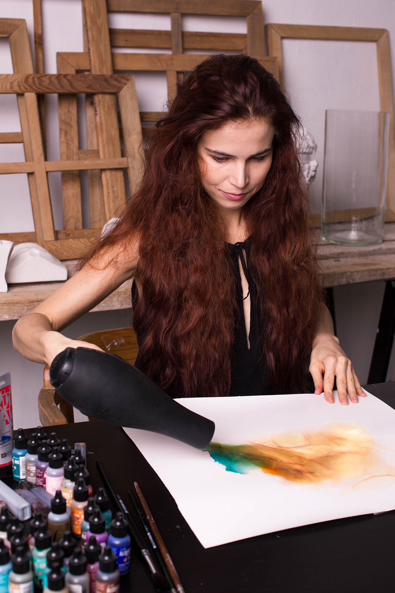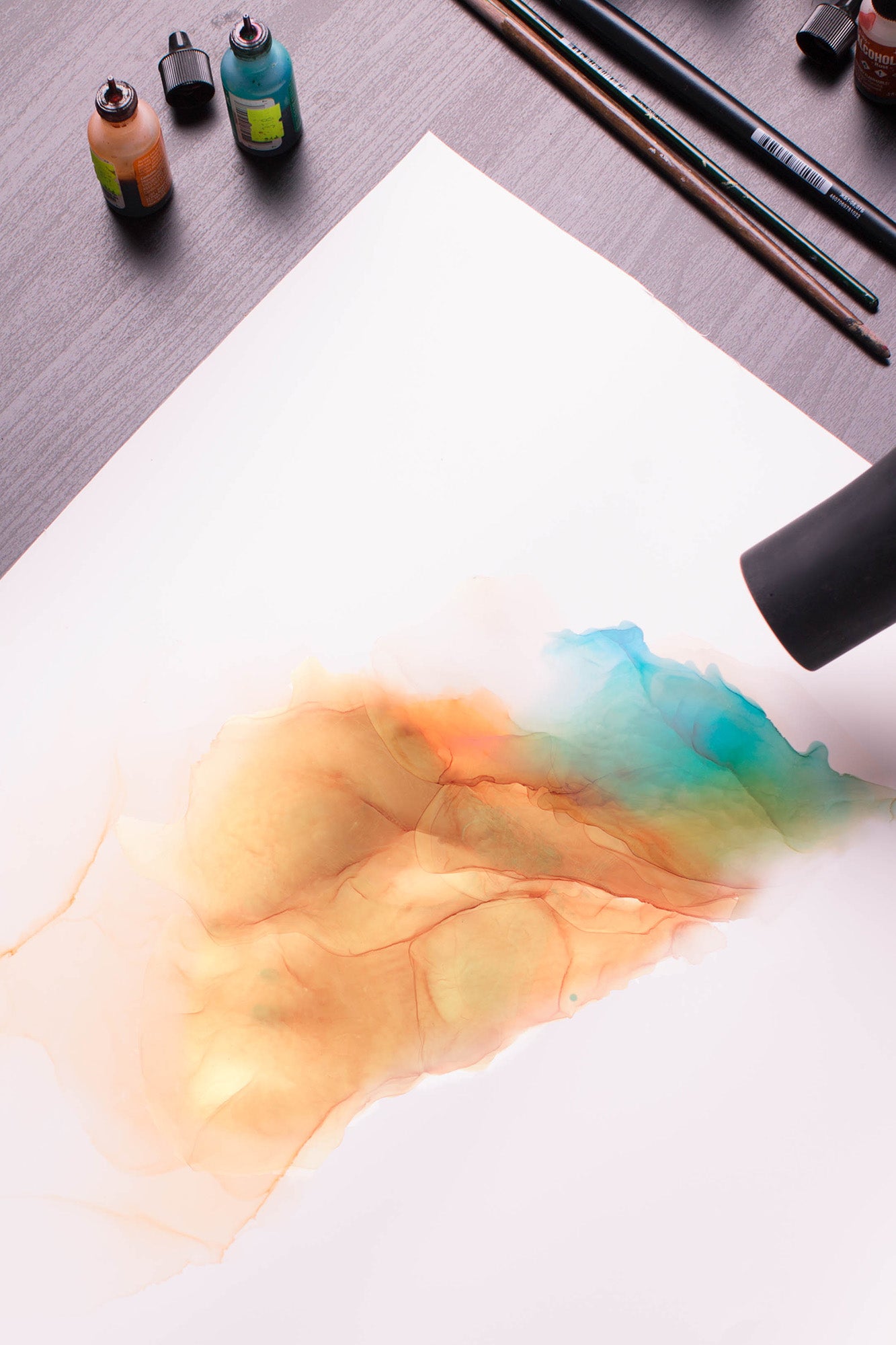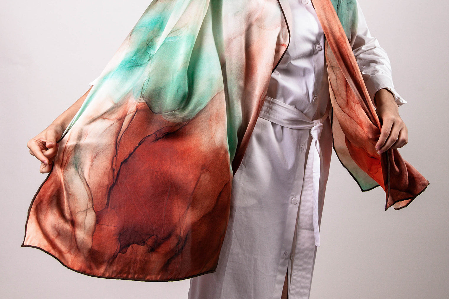 To create designs for our scarves we use acrylic and watercolor paints as well as alcohol inks, which, driven and directed by a warm air flow, take various shapes on special plastic paper. Controlling the force and direction of the swirls of hot air like an invisible brush you give birth to unique color interweavings which one may contemplate for hours, each time finding new shapes concealed deep within their irrational depths.